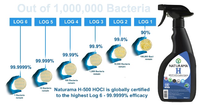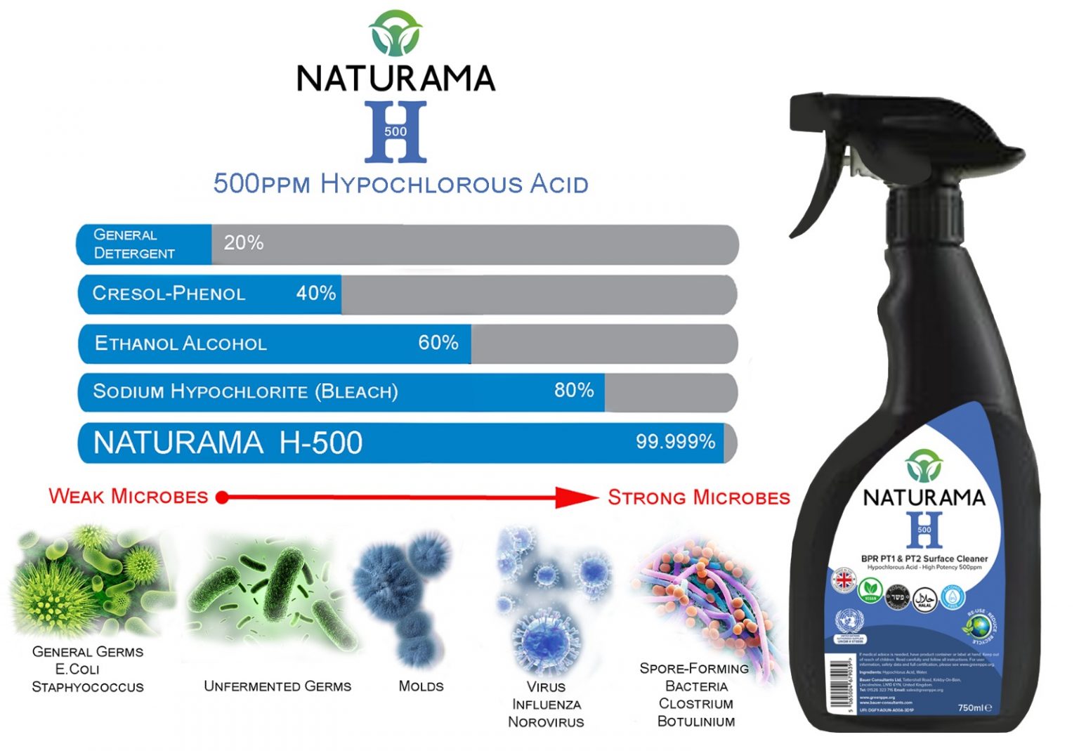 NATURAMA H-500 is a pure and very stable hypochlorous acid (HOCL) widely used as a disinfectant, because of