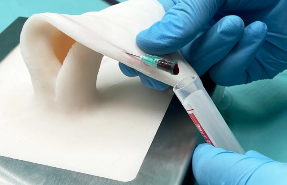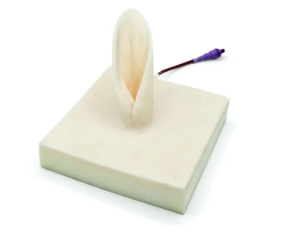 This flexible rabbit ear allows for training in blood sampling and the insertion of a venous catheter into the auricular vein.